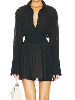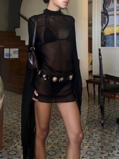 Women Elegant Shirt Dress Mesh Sheer