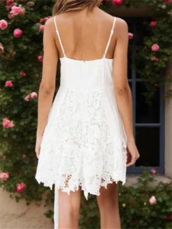 Women Sling Dress, Spaghetti Straps V-neck Lace Solid Summer Mini Dress for Club Party