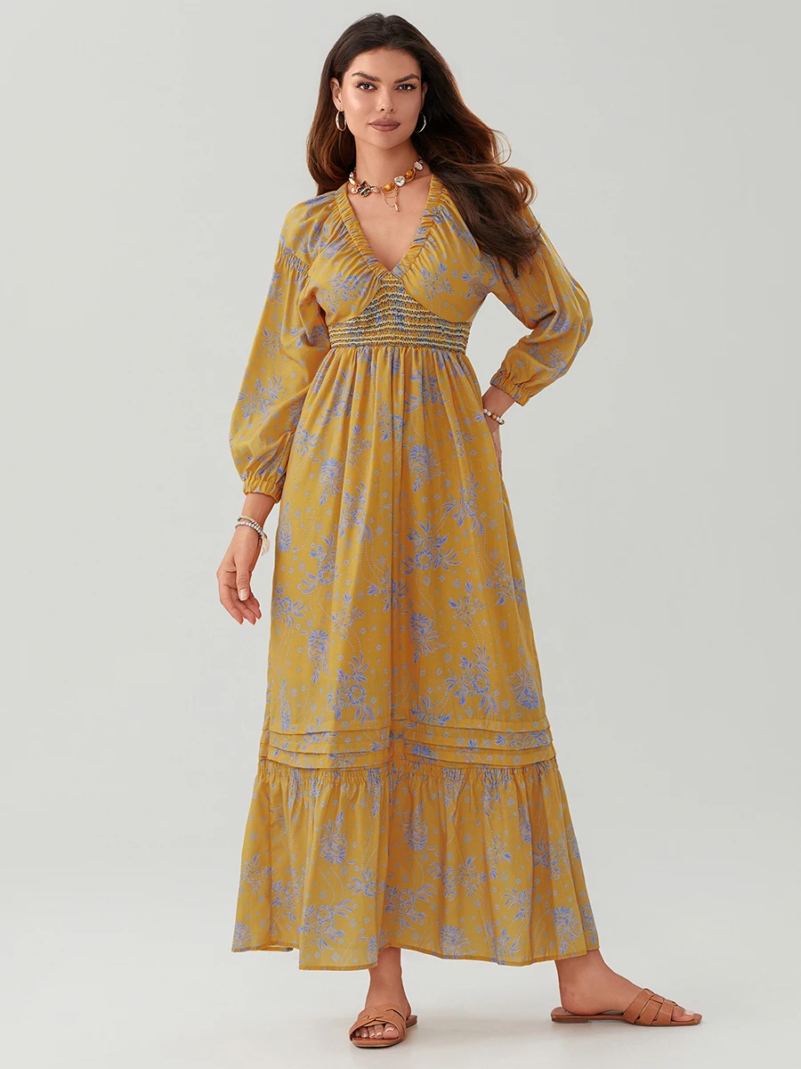 Womens Bohemian Floral Dress Summer Half Sleeve V Neck Shirred Waist A-Line Dress Long Flowy Dress