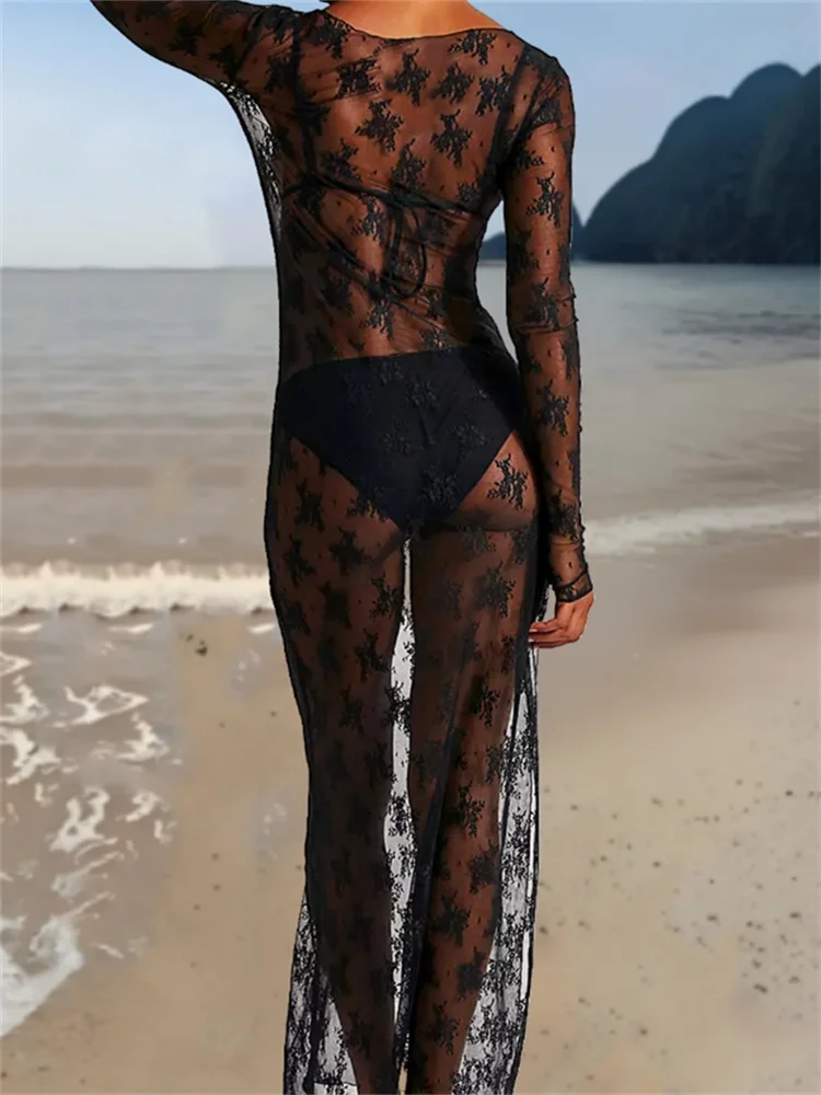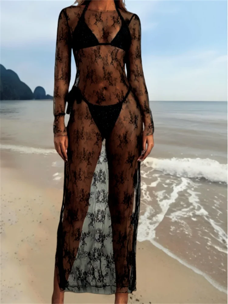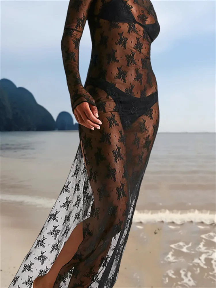 Womens See-Through Lace Dress, Long Sleeve Round Neck Slit Hem Dress Chemise Beach Vacation Party Wear