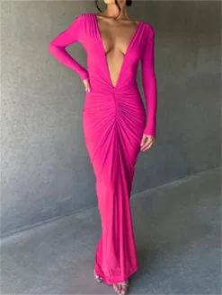Women Long Bodycon Dress Solid Color Deep V-Neck Ruched Long Sleeve Dress Spring Fall Evening Party Dress